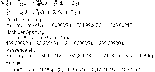 2 a) Die angegebene Reaktionsgleichung einer Kernspaltung von U-235 durch Neutronenbeschuss ist nur eine der möglichen Spaltreaktionen. Bei zwei anderen entstehen als Bruchkerne zum einen Cs-140 und Rb-94 und zum anderen Sr-93 und Xe-140.