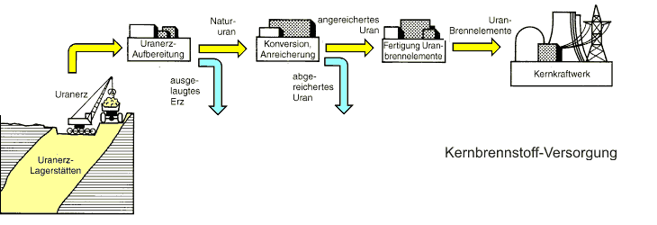 3 a) Skizzieren Sie den Weg der Brennstoffversorgung von Kernkraftwerken, vom Uranabbau bis zum Brennelement!