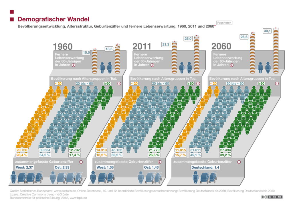 Im Jahr 2050 wird ca. jeder Dritte 60 Jahre oder älter sein. Das statistische Bundesamt erwartet, dass die deutsche Bevölkerung von 80,2 Millionen Einwohner im Mai 2011 (Quelle: Zensus 2011) auf 74 Millionen Einwohner zurückgeht. Deutschland steht nach Einschätzung von Experten ein „dramatischer“ Alterungsprozess seiner Bevölkerung bevor. Nach den jüngsten Berechnungen wird im Jahr 2050 jeder dritte in Deutschland lebende Bürger 60 Jahre oder älter sein. Gründe hierfür sei eine steigende Lebenserwartung bei gleichzeitig sinkenden Geburtenzahlen.