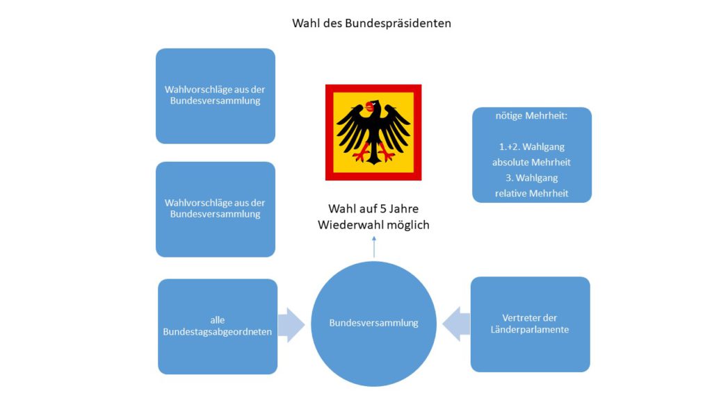 Die Wahl des Bundespräsidenten erfolgt durch die Bundesversammlung für fünf Jahre (Artikel 54 GG). Eine einmalige Wiederwahl ist zulässig. Die Bundesversammlung wird aus den Mitgliedern des Bundestages und einer gleichen Anzahl von Delegierten gebildet, die von den Landesparlamenten entsprechend der Fraktionsstärke entsandt werden, zum Teil sind dies Landtagsabgeordnete, Kommunalpolitiker und Persönlichkeiten des öffentlichen Lebens. Die Wahl erfolgt ohne Aussprache. Wählbar ist jeder Deutsche, der das 40. Lebensjahr vollendet hat.