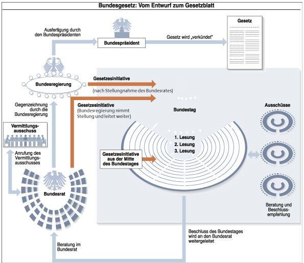 Chancen, auf die Politik der Regierung Einfluss zu nehmen, eröffnet das bundesstaatliche System. Es sieht eine Mitwirkung des Bundesrates an der Gesetzgebung vor. Wenn im Bundesrat Landesregierungen die Mehrheit haben, die der Opposition im Bundestag entsprechen, muss sich die Regierung bei Gesetzen oder auch bei außenpolitischen Verträgen mit der Opposition verständigen, um nicht einen (aufschiebenden) Einspruch oder eine Ablehnung im Bundesrat zu riskieren. Jede Opposition steht vor der Frage, ob sie in erster Linie die Auseinandersetzung mit der Regierung suchen oder ob sie durch Zusammenarbeit Einfluss auf Entscheidungen nehmen will. In der Parlamentarischen Praxis der Bundesrepublik wechselten sich Phasen der Auseinandersetzung (Konfrontation) und Zusammenarbeit (Kooperation) ab. Scharfe Auseinandersetzungen gab es, wenn entscheidende politische Weichenstellungen bevorstanden, zum Beispiel die Wiederbewaffnung 1956 und die Ostpolitik der sozial-liberalen Koalition 1969-1972. Bei der Gesetzgebung hat die Opposition zumeist auf Kooperation gesetzt und versucht, die Gesetzte in ihrem Sinne zu verbessern.