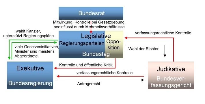 Das Grundgesetz knüpft an das Modell der klassischen Gewaltenteilung in Legislative, Exekutive und Judikative an, die von dem französischen Staatsphilosophen Montesquieu formuliert wurde. Diesem Modell liegt der Gedanke zugrunde, dass in einer politischen Ordnung die Freiheit nur gesichert ist, wenn die staatliche Macht nicht wie in den absoluten Monarchien in einer Hand liegt, sondern aufgeteilt ist. Wenn man das Modell von Montesquieu unmodifiziert auf die politischen Verhältnisse der Bundesrepublik übertragen würde, ergäbe sich das folgende Modell: