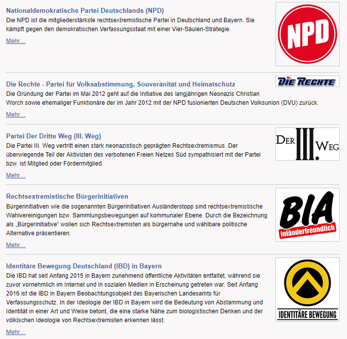 Die oben erwähnte Webseite führt folgende Parteien als rechtsextreme Parteien auf. Klicken Sie auf die Links, wenn Sie weitere Informationen über diese Parteien oder andere Gruppen der rechtsextremen Szene abrufen wollen.