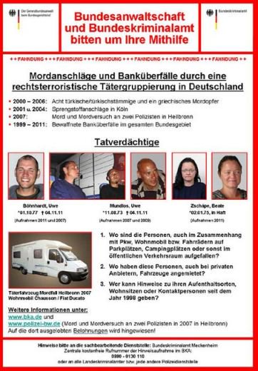 „Die Bundesanwaltschaft und das Bundeskriminalamt bitten um Mithilfe bei der weiteren Aufklärung einer Serie von Schwerverbrechen. Sie begann im Jahr 2000 mit einem Mordanschlag in Nürnberg und setzte sich bis zum Jahr 2006 mit Morden an insgesamt acht türkischen/türkischstämmigen Geschäftsinhabern und einem griechischen Geschäftsinhaber in Deutschland fort. Im Januar 2001 und im Juni 2004 fanden in Köln Sprengstoffanschläge auf ein Lebensmittelgeschäft bzw. vor einem Friseursalon statt, bei denen über 20 Personen zum Teil schwer verletzt wurden. Im April 2007 wurde in Heilbronn eine 22-jährige Polizistin erschossen und ihr Kollege lebensgefährlich verletzt. Daneben kam es im gesamten Zeitraum, zuletzt am 04.11.11 in Eisenach, zu einer Reihe von bewaffneten Banküberfällen im Bundesgebiet. Nach den derzeitigen Erkenntnissen ist für die Taten eine rechtsterroristisch ausgerichtete Gruppierung verantwortlich. Bei den bislang bekannten Mitgliedern der Gruppe handelt es sich um den 38-jährigen Uwe Mundlos und den 34-jährigen Uwe Böhnhardt, die sich am 04.11.2011 in Eisenach nach einem Banküberfall in einem Wohnmobil selbst töteten, sowie die 36-jährige Beate Zschäpe, die sich am 08.11.2011 den Polizeibehörden stellte und u. a. wegen Verdachts der Bildung einer terroristischen Vereinigung in Untersuchungshaft genommen wurde.“
