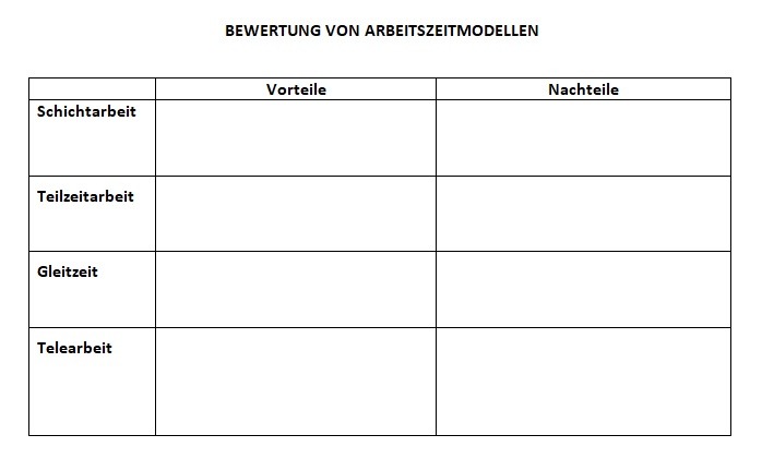 - Zunächst informieren Sie sich mithilfe der Anlagen (siehe unten) über verschiedene Arbeitszeitmodelle.