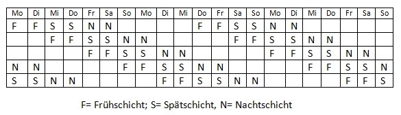 Bei allen Schicht-Systemen wechselt jeder Mitarbeiter die Schichten: z.B. 5 Tage Früh,- 5 Tage Spät-, 3 Tage Nachtschicht