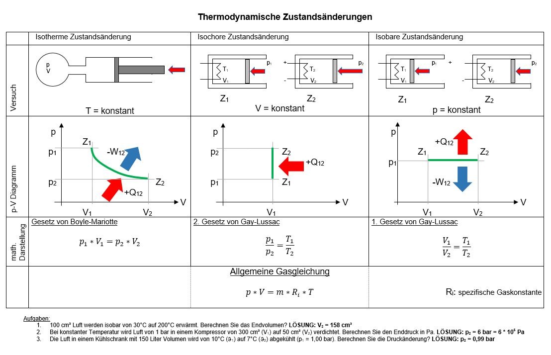 Die umgesetzten Energien bei den einzelnen Zustandsänderungen sind in der Lösung zum Arbeitsblatt Zustandsänderungen eingetragen. Ändert sich die Richtung der Zustandsänderung, z.B. von der isothermen Expansion zur isothermen Kompression, so ändern sich die Vorzeichen der umgesetzten Energien.