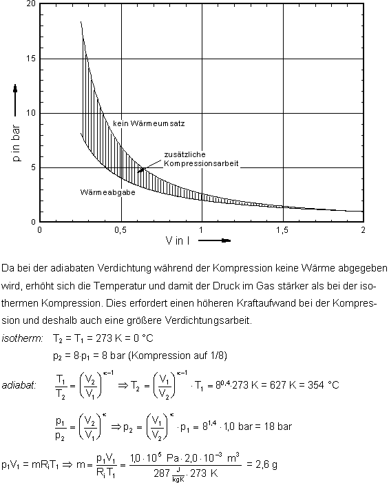 5 In einem Zylinder wird Luft ausgehend von einem Zustand 1 (p1=1,0 bar; V1 = 2,0 l; J1 = 0°C) einmal isotherm und einmal adiabat verdichtet. Beide Kompressionen sollen zu dem gleichen Endvolumen V2 = 0,25 l führen. Folgende Aufgaben sind zu lösen: