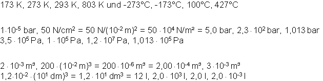1 Für die drei wichtigen Zustandsgrößen Temperatur, Druck und Volumen sollen die Formelzeichen, je zwei Einheiten und ihre Umrechnungen angegeben werden.