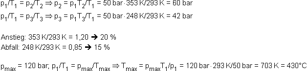 3 Ein Propangasbehälter, der im Freien steht, enthält eine feste Menge Propangas. Eine Messung ergibt einen Gasdruck von 50 bar bei einer Gastemperatur von 20°C. In der sommerlichen Mittagssonne erwärmt sich das Gas auf 70°C. In einer kalten Winternacht sinkt die Temperatur auf -25°C. Der Propangasbehälter ist bis zu einem Druck von 120 bar ausgelegt. Führen Sie folgende Berechnungen durch: