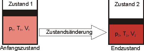 Durch diese Zustandsänderung verändern sich im Allgemeinen die Werte der Zustandsgrößen. Im Zustand 1 haben die Zustandsgrößen p, T und V die konstanten Werte p1, T1, V1, im Zustand 2 die konstanten Werte p2, T2, V2. Um das System von einem Zustand 1 in einen Zustand 2 zu bringen, muss mit ihm ein geeigneter thermodynamischer Prozess durchgeführt werden. Beispielsweise könnte ein solcher Prozess darin bestehen, wie oben angedeutet ist, den Kolben des Arbeitszylinders mit erhöhter Kraft nach unten zu drücken. Dieser Prozess bewerkstelligt dann die Zustandsänderung 1 zu 2. Es wären aber auch andere Prozesse denkbar, um die Zustandsänderung 1 zu 2 hervorzurufen.