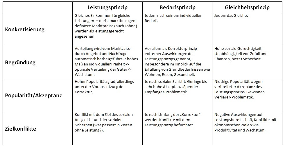 - Gleiches Einkommen für gleiche Leistungen! – meist marktbezogen definiert: Marktpreise (auch Löhne) werden als leistungsgerecht angesehen.