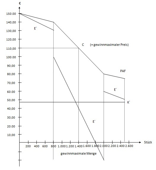 Das Gewinnmaximum ermittelt sich bei der Menge im monopolistischen Bereich, bei der die Grenzkosten den Grenzerlösen entsprechen: