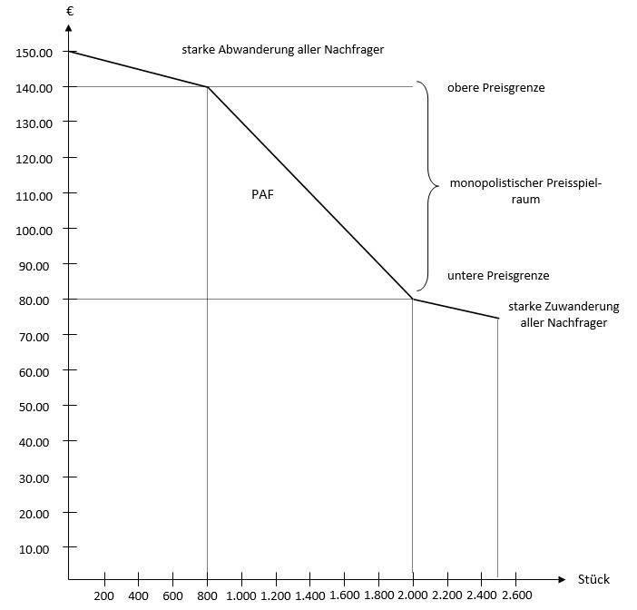Wird das Nachfrageverhalten grafisch abgebildet, ergibt sich eine doppelt geknickte Preis-Absatz-Funktion. Zwischen der Preisobergrenze (p1) und der Preisuntergrenze (p2) ist die Nachfrage relativ unelastisch. Eine Preiserhöhung führt in diesem Bereich nur zu einem geringeren Nachfragerückgang. Bei Preissteigerungen über p1 hinaus, verliert der Anbieter jedoch alle Nachfrager. Setzt der Anbieter den Preis zu niedrig fest, wechseln alle Nachfrager aufgrund des günstigen Angebots zu ihm über. Aber da sein Marktanteil zu gering ist, kann er diese Nachfrage nicht befriedigen.