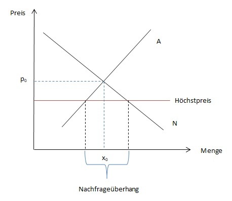 Der Staat (Bund, Länder und Gemeinden) kann unterschiedlich stark in das Wirtschaftsgeschehen eingreifen. In der sozialen Marktwirtschaft hat der Staat einen ziemlich weiten Gestaltungsspielraum. Marktkonforme Maßnahmen sind Staatseingriffe in die Wirtschaft, die den Markt-Preis-Mechanismus nicht außer Kraft setzen (indirekte Staatseingriffe). Hierzu zählen: Steuern, Zölle und Abgaben, Subventionen und Transferzahlungen sowie staatliche Stützungskäufe. Durch marktkonträre Maßnahmen wird die Marktpreisbildung außer Kraft gesetzt (direkte Staatseingriffe). Hierzu zählen z. B. Festpreise, Mindestpreise und Höchstpreise. Begrenzt der Staat den am Markt gehandelten Preis nach oben, handelt es sich um einen Höchstpreis. Dieser staatliche Höchstpreis darf nicht überschritten werden. Der Höchstpreis soll die Nachfrager vor zu hohen Ausgaben für lebensnotwendige Güter schützen. Er wird vor allem in Mangelzeiten, wenn die Nachfrage sehr groß ist, eingeführt, um die Bevölkerung mit den knappen, lebensnotwendigen Gütern zu versorgen. Der Höchstpreis liegt stets unter dem Gleichgewichtspreis, der sich ohne staatliches Eingreifen am Markt gebildet hätte. Der Preis verliert durch den Staatseingriff die Preisausgleichsfunktion, da er nicht mehr durch die Nachfragekonkurrenz bis zum Gleichgewichtspreis steigen kann. Der Höchstpreis verhindert kurzfristig zwar das Steigen der Preise, bewirkt langfristig aber einen Versorgungsmangel. So hat eine Mietpreisbindung langfristig stets ein Nachlassen der Neubautätigkeit für Mietobjekte nach sich gezogen, da die Bauherren nicht bereit waren, zu den niedriger festgesetzten Mieten zu investieren. Auch Überbelegungen oder kurzzeitige Vermietungen an z. B. Urlauber sind die Folge. Die Versorgung der Bevölkerung wird also beim staatlich festgelegten Höchstpreis durch das zu geringe Angebot nicht gewährleistet. Die Höchstpreispolitik führt also zu einem Nachfrageüberhang (Verkäufermarkt), weil bei dem niedrigeren Höchstpreis das Angebot kleiner als die Nachfrage ist. Aus diesem Grund muss der Staat eine zusätzliche Mengenregulierung einführen. Beispiele hierfür sind z. B. Wartelisten bei der Vergabe von Sozialwohnungen oder auch Lebensmittelmarken nach dem Zweiten Weltkrieg. Dies ist erforderlich, da sonst andere Nachfrager das knappe Gut erhalten, z. B. weil sie sich als Erste in die Warteschlange einreihen (Windhundverfahren) oder persönliche Beziehungen nutzen können (Vetternwirtschaft). In dieser Situation bilden sich häufig auch Schwarzmärkte, auf denen die Güter illegal zu höheren Preisen gehandelt werden.