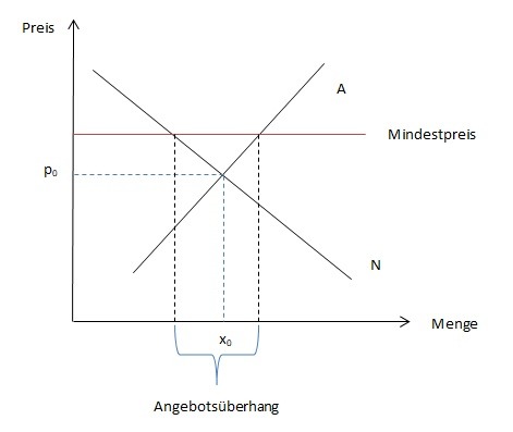 Mindestpreise liegen über dem Preis, der sich bei freier Preisentwicklung ergeben würde. Sie dienen dem Schutz des Produzenten. Durch den Mindestpreis werden die Produzenten zu Mehrproduktion angeregt, die die Verbraucher aufgrund des hohen Preises nicht restlos aufnehmen wollen oder können. Mindestpreise führen zu einem Angebotsüberhang. Der Mindestpreis ist nur haltbar, wenn der Staat die Überschussproduktion aufkauft.