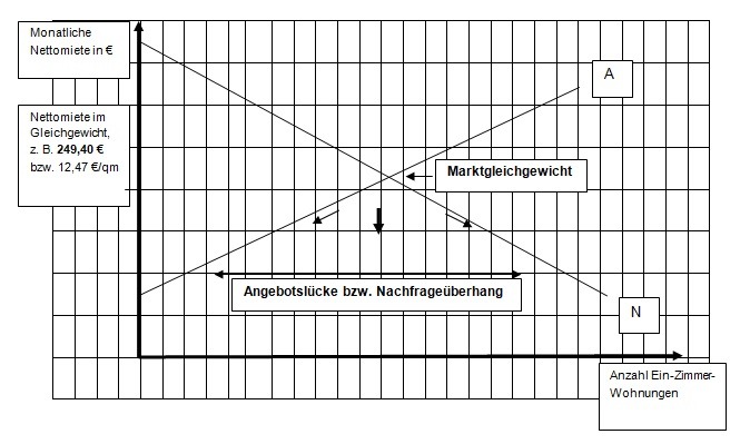 2.4 Skizzieren Sie die Angebotskurve und die Nachfragekurve für Ein-Zimmer-Wohnungen in einem geeigneten Preis-Mengen-Diagramm und ermitteln Sie die monatliche Nettomiete (ohne Umlagen) im Marktgleichgewicht.