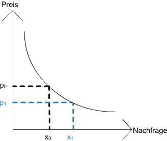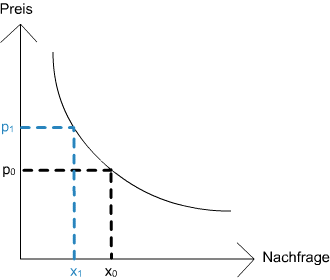 Ändert sich der Preis des nachgefragten Gutes, so sinkt oder fällt die Nachfrage. Dieser Zusammenhang wird im Koordinatensystem folgendermaßen dargestellt: